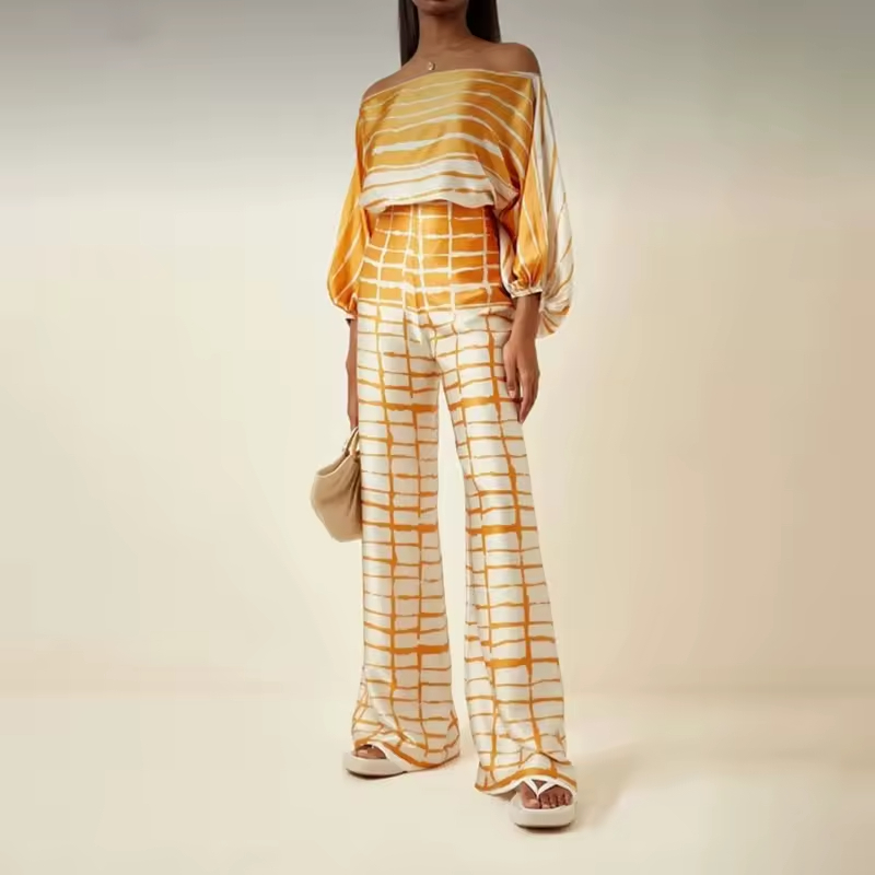 Printed Two Piece Set Chic Off Shoulder Batwing Sleeve Blouse with Comfortable Wide Leg Pants Women’s Suit